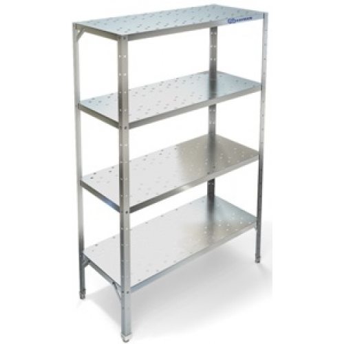 Стеллаж кухонный. Стойки из оцинкованного уголка, (уголок 40х40), полки перфорированные из нержавеющей стали AISI 430. Стеллажи используются в кухонных цехах для хранения сухих видов продуктов и кухонного инвентаря. Стеллаж имеет разборную конструкцию и состоит из четырёх стоек и четырёх полок. Стойки изготовлены из оцинкованного уголка толщиной 1,5 мм. Полки сплошные с перфорацией изготовлены из нержавеющей стали AISI430, могут крепиться на требуемой высоте - шаг 100 мм. Ножки стеллажа снабжены регуляторами высоты, что позволяет устранять неровности пола и дополнительные конструктивные элементы, предназначенные для предотвращения его раскачивания во время работы и придающие большую устойчивость. Универсальная конструкция позволяет легко производить сборку стеллажей. Нагрузка на каждую полку не более 80 кг.